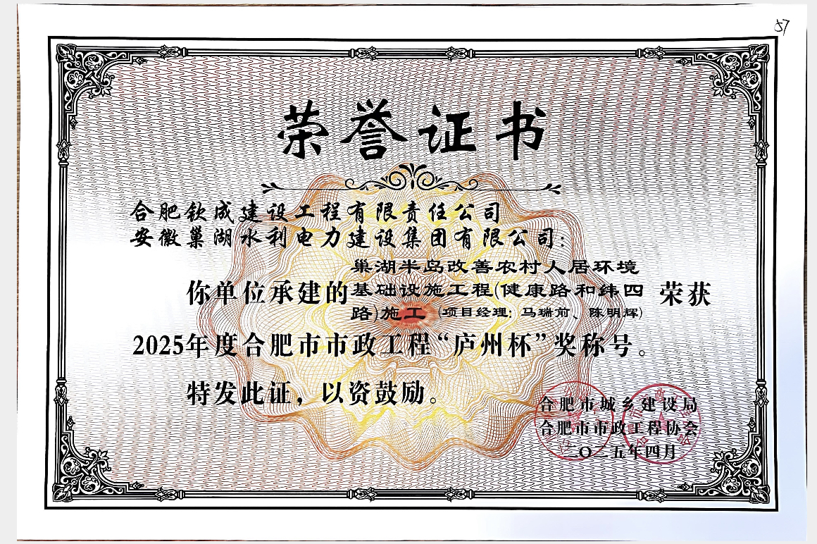 巢湖半島改善農村人居環境基礎設施工程(健康路和緯四路)施工榮獲“廬州杯”證書