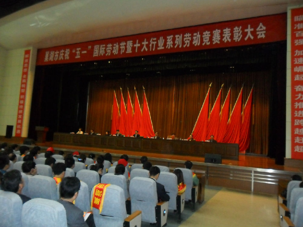 2014年4月30日上午在巢湖市政府會議廳召開巢湖市慶祝“五”國際勞動節暨十大行業系列勞動競賽表彰大會。我公司員工圣后宏同志在“巢湖市十大行業系列勞動競賽”中取得第名(等獎)的異成績,榮獲“巢湖市五勞動獎”和“合肥市金職工”榮譽稱號(左起第四位)。