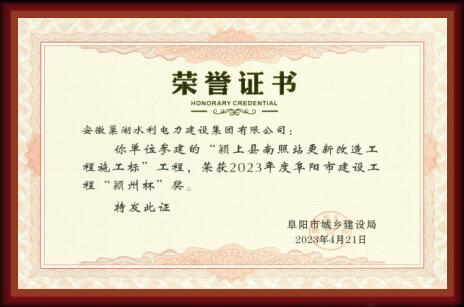 穎上縣南照站更新改造工程施工標(biāo)工程榮獲“穎州杯”獎(jiǎng)