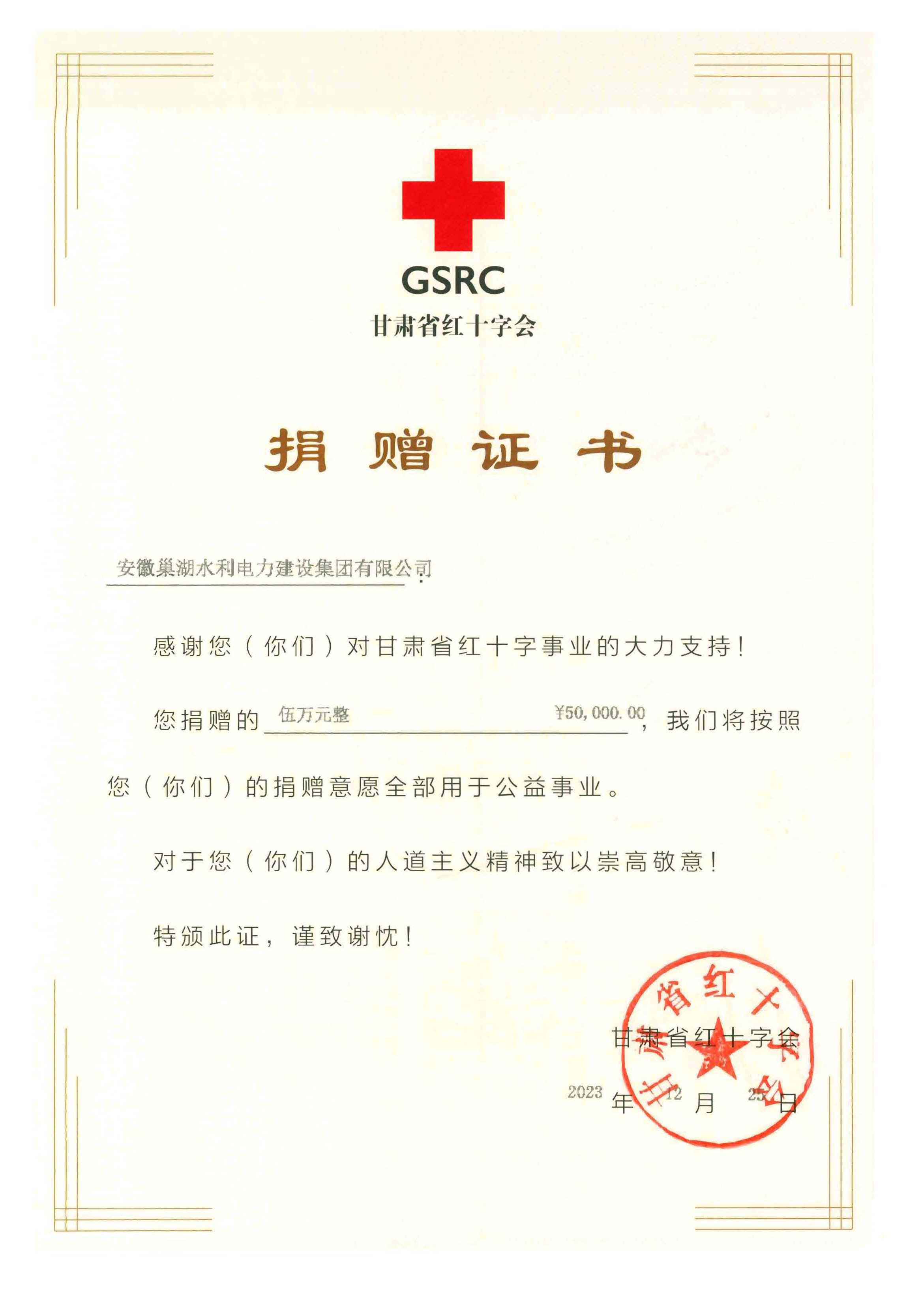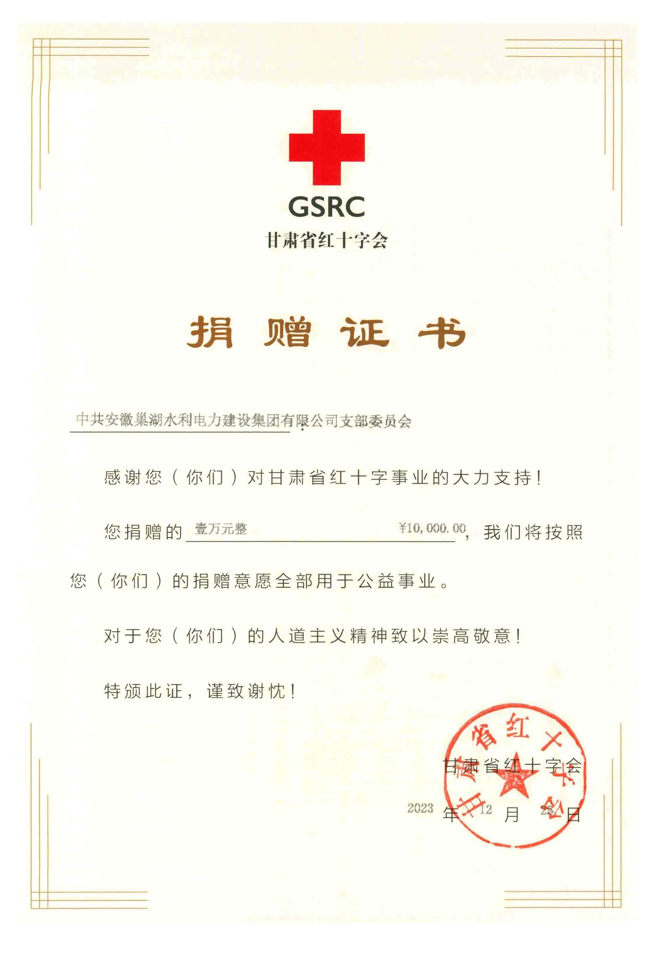 為支持災區(qū)人民抗震救災,安徽巢湖水利電力建設(shè)集團有限公司第一時間發(fā)出倡議書,號召廣大黨員干部、職工積極捐款,充分履行企業(yè)責任擔當。12月22日上午,安徽巢湖水利電力建設(shè)集團有限公司舉行向甘肅地震災區(qū)捐款活動,公司領(lǐng)導帶領(lǐng)全體員工積極參加捐款,大家同心協(xié)力、眾志成城,將愛心奉獻給災區(qū)人民。在此次活動中,公司和黨支部分別捐款5萬元和1萬元,捐款將通過甘肅省紅十字會及時送到交區(qū)人民手中,幫助災區(qū)人民共渡難關(guān)。12月25 日公司收到了來自甘肅省紅十字會分別向公司和公司黨支部發(fā)來2本捐贈證書。千言萬語繪制成一紙證書,記錄安徽巢湖水利電力建設(shè)集團有限公司全體員工與受災群眾風雨同舟、團結(jié)一心、共克災情。希望我們每個人的微小之力,積水成淵,用我們的愛心溫暖了這個冬天。