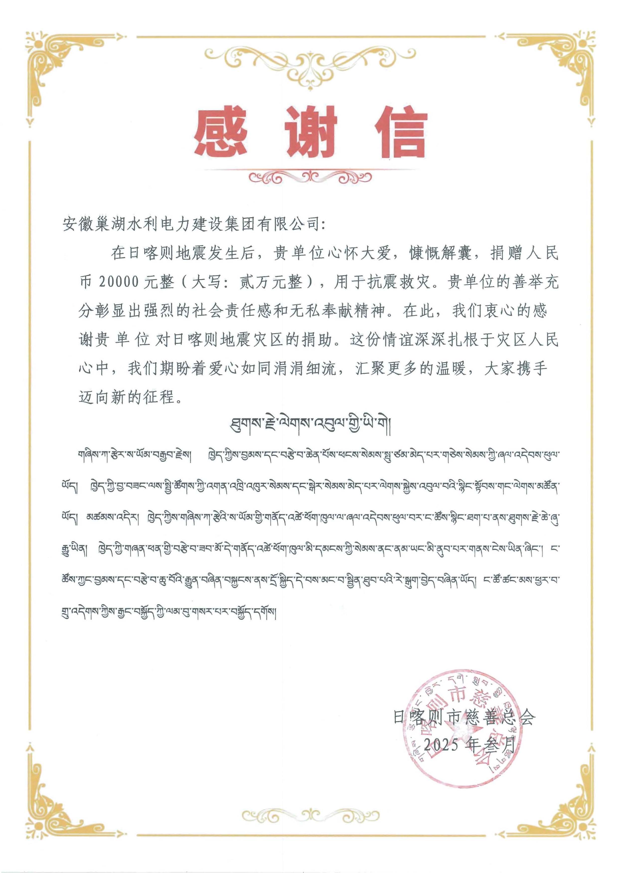 安徽巢湖水利電力建設集團有限公司為支援西藏日喀則地區抗震救災工作,積極履行企業社會責任,我司向此次地震災區捐贈人民幣貳萬元,用于受災群眾生活保障、災后重建及相關救援工作。