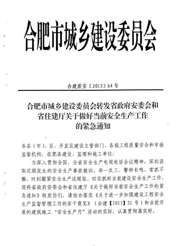 在巢各建設、施工和監理企業,局屬有關單位:?xml:namespace> 現將《合肥市城鄉建設委員會轉發省政府安委會和省住建廳關于做好當前安全生產工作的緊急通知》(合建質安[2013]64號)轉發給你們,請結合合肥市城鄉建委《關于進步加強建設工程安全生產監督管理工作的若干意見》(合建[2013]31號)文要求和當前開展的安全生產“百日整治”行動,進步提高認識,認真抓好落實。 附: 附件:1.合肥市城鄉建設委員會轉發省政府安委會和省住建廳關于做好當前安全生產工作的緊急通知 2.安徽省住房城鄉建設廳轉發省政府安全生產委員會關于做好當前安全生產工作的緊急通知 3.安徽省政府安全生產委員會關于做好當前安全生產工作的緊急通知 巢湖市住房和城鄉建設局 2013年7月8日 安徽省住房城鄉建設廳轉發省政府安全生產委員會關于做好當前安全生產工作的緊急通知 皖建質明電〔2013〕17號 為深入貫徹全國、全省安全生產電視電話會議精神,深刻汲取近期發生的安全生產事故教訓,舉反三,警鐘長鳴,常抓不懈,時刻繃緊安全生產這根弦,切實抓好當前建設安全生產工作,現將省政府安全生產委員會《關于做好當前安全生產工作的緊急通知》(皖安明電〔2013〕2號)轉發給你們,并提出如下要求,請并貫徹執行。 、進步提高做好當前住房城鄉建設系統安全生產工作端重要性的認識,全面落實安全生產責任 各級住房城鄉建設主管部門要牢固樹立科學發展、安全發展理念,堅持“安全第、預防為主、綜合治理”的方針,進步加強組織導,堅決克服麻痹松懈情緒,增強做好安全生產工作的緊迫感和責任感,全面落實安全生產責任。 二、突出重點,立即開展安全生產大檢查 各級住房城鄉建設主管部門要突出重點,特別是要針對建設系統行業域安全生產工作的特點,結合當前“打非治違”和“安全生產月” 等活動,立即部署開展次安全生產大檢查,全面徹底排查治理事故隱患。 1、建筑施工:深入開展以高大模板、深基坑、腳手架、垂直起重機械等重大危險源為重點的專項整治工作。要強化高大模板專家論證、過程驗收、日常監管等工作,切實抓好邊坡基坑支護等防坍塌措施,進步加強對腳手架、塔吊基礎硬化、排水措施的監督巡查,持續抓好臨邊洞口、施工用電防護等安全措施。繼續開展“打非治違”專項治理行動,嚴厲打擊非法違法工程。 2、城市道路、橋梁:立即開展對既有城市道路、橋梁的隱患排查,加強對城市橋梁的整體結構安全性、安全護欄以及自動扶梯等重點環節、部位的監督檢查,并通過此次大檢查建立健全城市道路、橋梁日常檢測維修的長效機制。 3、燃氣、供水:加強對燃氣、供水企業的日常巡查監督工作,確保城市生命線工程的正常運營,督促企業完善應急預案,定期開展應急演練。 4、風景名勝區:各風景名勝區管委會要做好節假日期間景區內火災隱患排查治理工作,加強對應急疏散通道的檢查,保證游客應急通道暢通。結合“安全生產月”活動,在景區內積開展安全宣傳活動。 5、城市軌道交通:加強對城市軌道交通工程防坍塌措施的檢查,以及做好對基坑支護、周邊建筑物沉降的實時監控,并完善各項安全應急措施。 三、加強督查和處罰力度,切實增強安全監管工作實效 各級住房城鄉建設主管部門要加強監督檢查,推進各項安全工作落實到位,對排查出的安全隱患采取“零容忍”措施,該停工的律停工、該停產的律停產、該處罰的律處罰。要做到切隱患歸零后,方可投入生產。要充分利用“安全生產月”活動的有效載體,廣泛宣傳“強化安全基礎,推動安全發展”的主體,宣傳典型,加大對違法行為、典型事故案例、重大事故隱患的曝光力度,形成社會監督的強大合力,促進安全生產形勢持續穩定好轉。 安徽省住房和城鄉建設廳 2013年6月9日 關于做好當前安全生產工作的緊急通知 (皖安明電〔2013〕2號) 各市人民政府,省直有關部門: 為貫徹全國、全省安全生產電視電話會議精神,深刻汲取近期發生的重特大生產安全事故教訓,舉反三,警鐘長鳴,常抓不懈,時刻繃緊安全生產這根弦,深入有效地開展全國第十二個“安全生產月”活動,切實做好當前安全生產工作,確保人民群眾生命財產安全,促進全省安全生產形勢持續穩定好轉。現就有關事項通知如下: 、高度重視,全面落實安全生產責任 各地區、各有關部門和單位要牢固樹立科學發展、安全發展理念,堅持“安全第、預防為主、綜合治理”的方針,進步加強組織導,層層落實安全責任,堅決克服麻痹松懈情緒,增強做好安全生產工作的緊迫感和責任感。各地區要強化對安全生產形勢的分析研判,根據地區環境特點和氣候變化等因素,針對重點、難點問題,采取果斷措施,嚴格事故防范。各級行業主管部門要切實落實行業監管責任,加強對本行業域安全生產工作的指導與監管。各類生產經營單位要全面落實安全生產主體責任,切實加強安全管理。 二、突出重點,立即開展安全生產大檢查 各地區、各有關部門和單位要突出重點,針對不同行業域、不同地區、不同企業的特點,結合當前“打非治違”和“安全生產月”活動等工作,立即組織開展次安全生產大檢查,全面徹底排查治理事故隱患。 ()煤礦:要認真吸取近期多起煤礦瓦斯爆炸事故的教訓,深入推進瓦斯綜合治理,切實落實“四位體”防突措施,加大隱患排查治理力度。