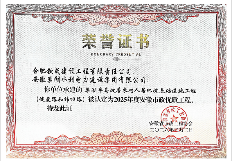 巢湖半島改善農村人居環境基礎設施工程(健康路和緯四路)施工榮獲2025年度安徽市政優質工程獎